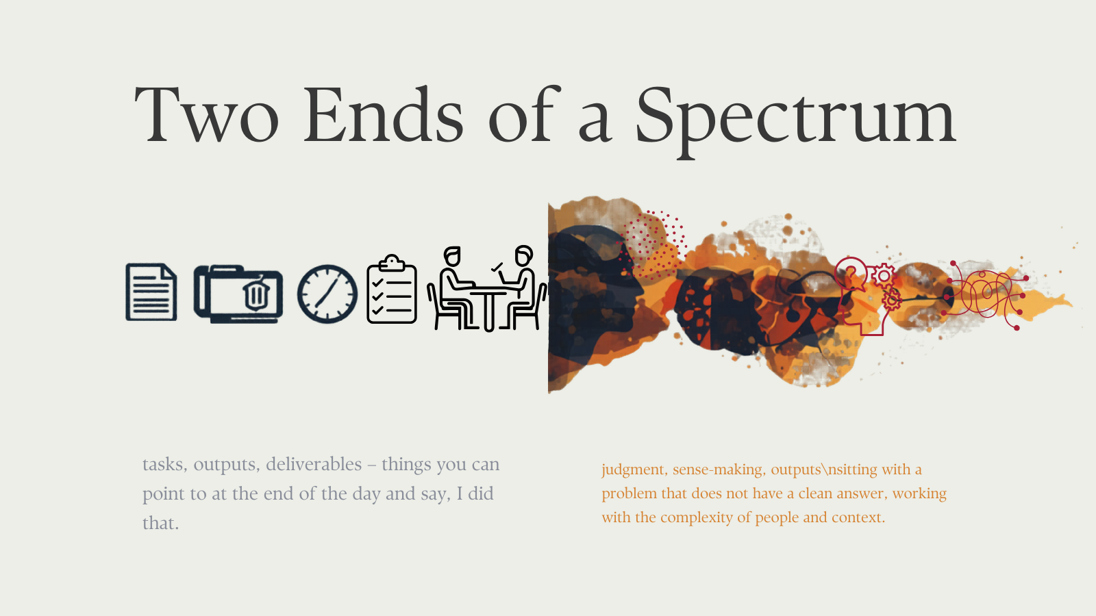 At one end is execution: tasks, outputs, deliverables — things you can point to at the end of the day and say, I did that.